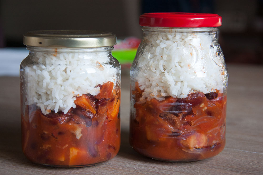 Servir le chili sin carne, accompagné du riz et d’une belle cuillère de guacamole ! Se préparer un beau bocal avec les restes 🙂