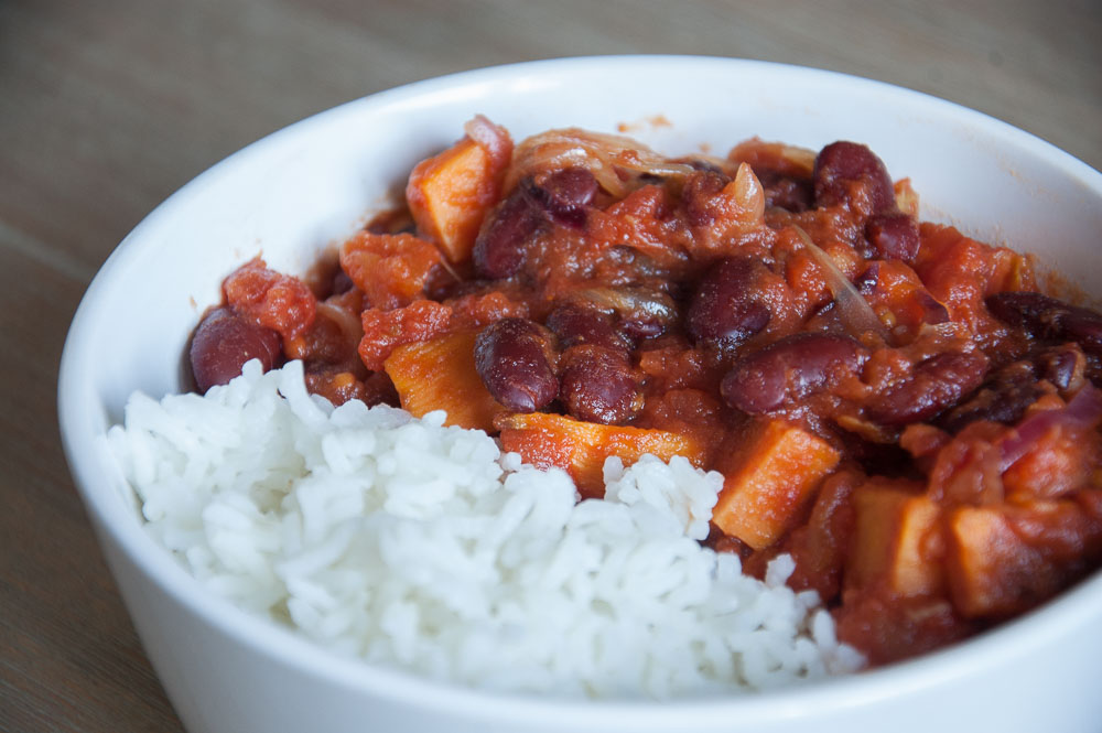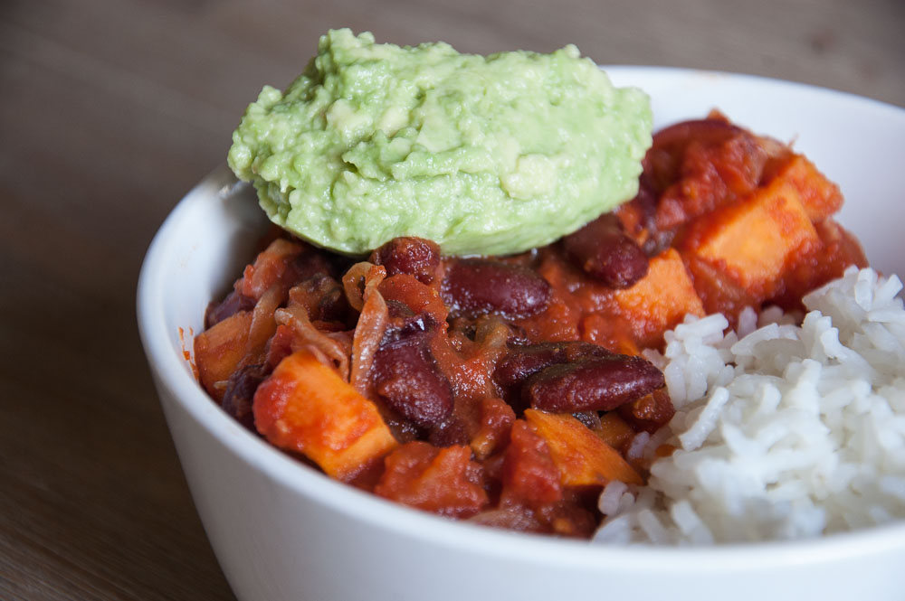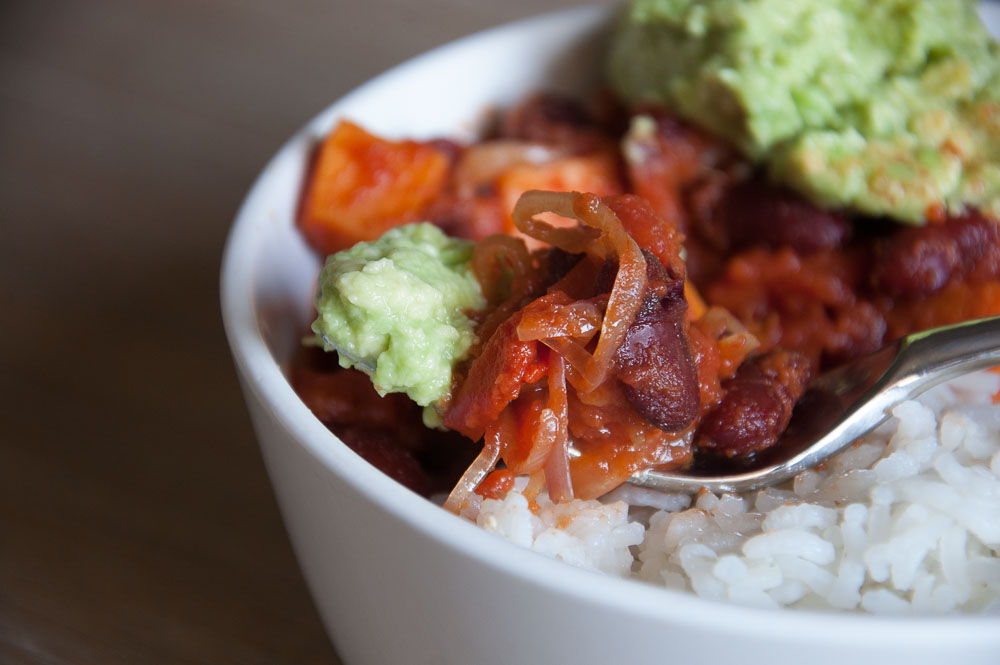 On a un plat bien équilibré avec des légumineuses, de la patate douce, des tomates concassées, des épices, du riz et de l’avocat ! Avec quelques feuilles de salade verte en entrée, c’est un repas idéal ! L’ensemble, relevé par une touche de piment et le paprika fumé est adoucit par le guacamole… c’est une tuerie ! Vraiment !