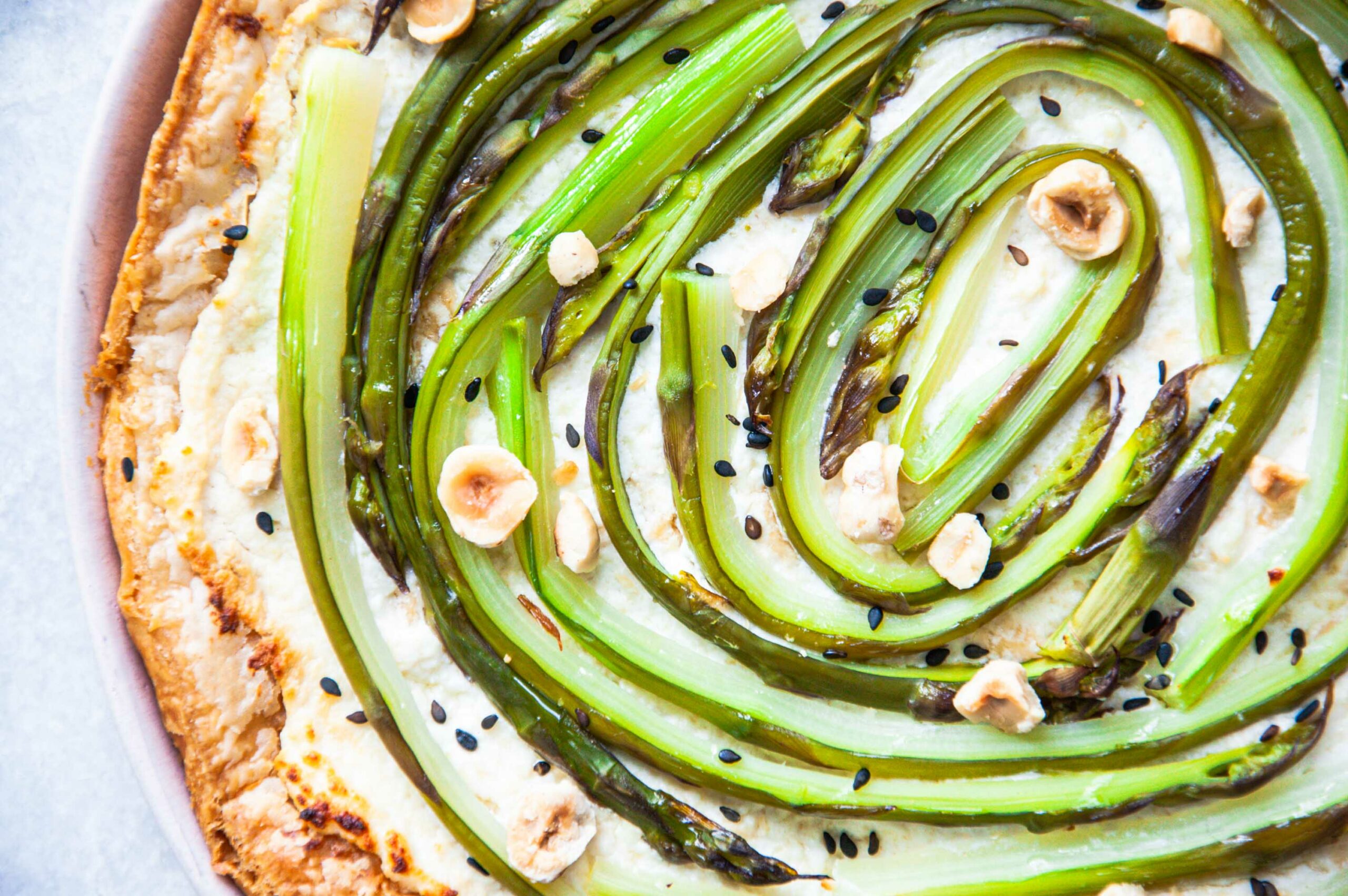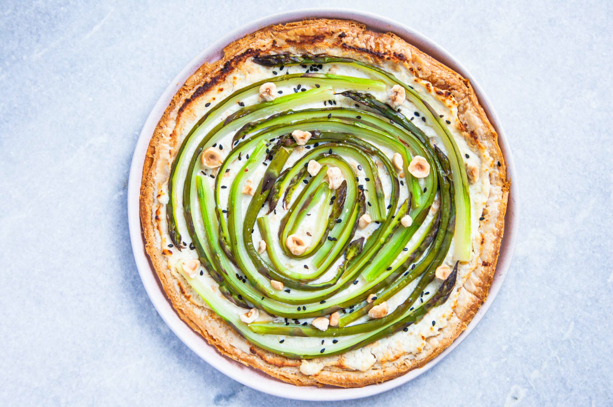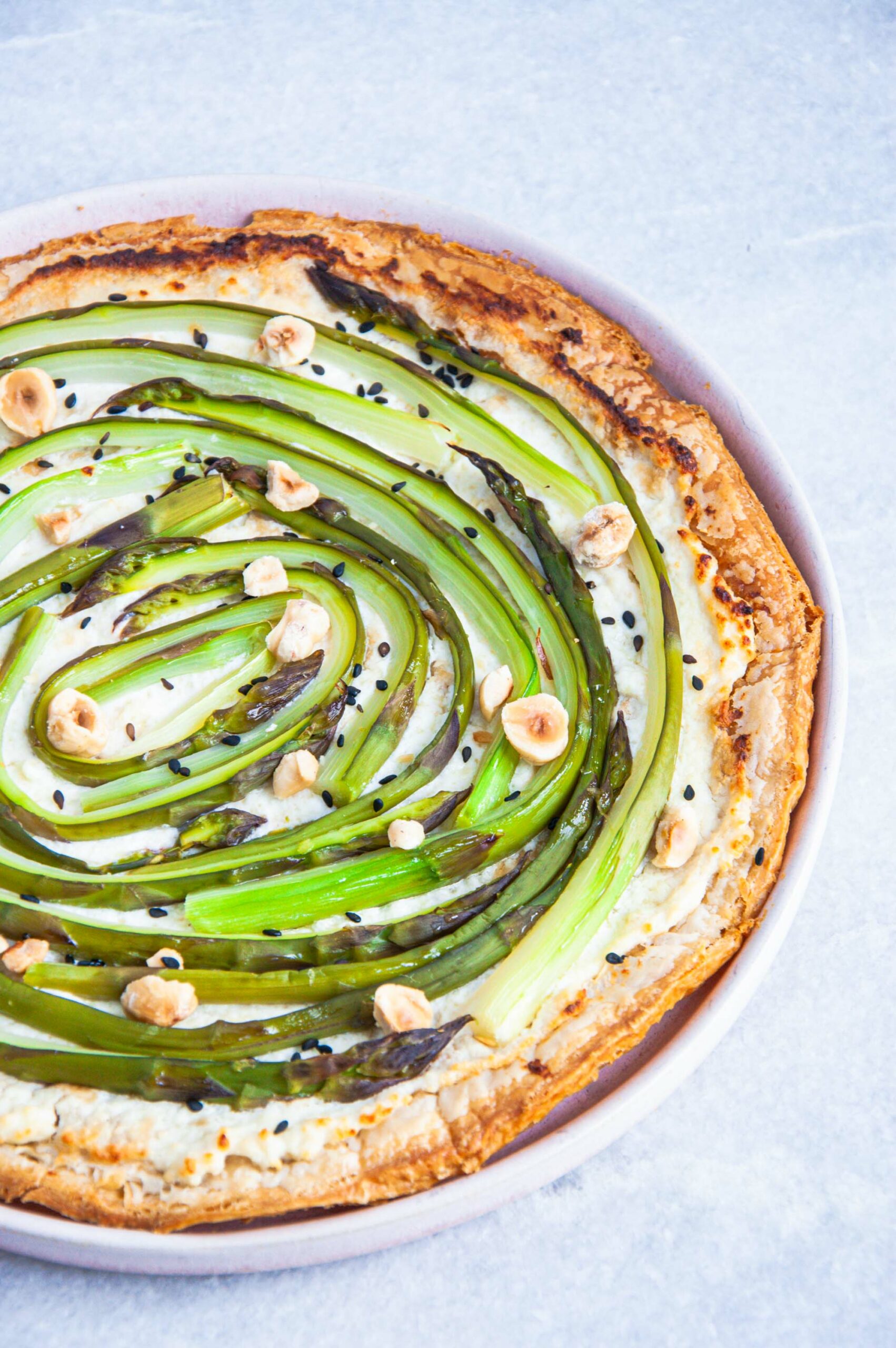 Pour la base, je me suis tournée vers une pâte feuilletée afin d’avoir une bonne dose de croustillant ! J’ai ensuite réutilisé la garniture de ma tarte aux tomates que j’adore, à savoir un mélange de ricotta, parmesan, ail et jus de citron ! Cette préparation se marie à merveille avec les asperges ! Pour servir, quelques copeaux de parmesan et quelques noisettes torréfiées feront l’affaire ! C’est une recette simple mais délicieuse, qui sera idéale avec une salade verte !